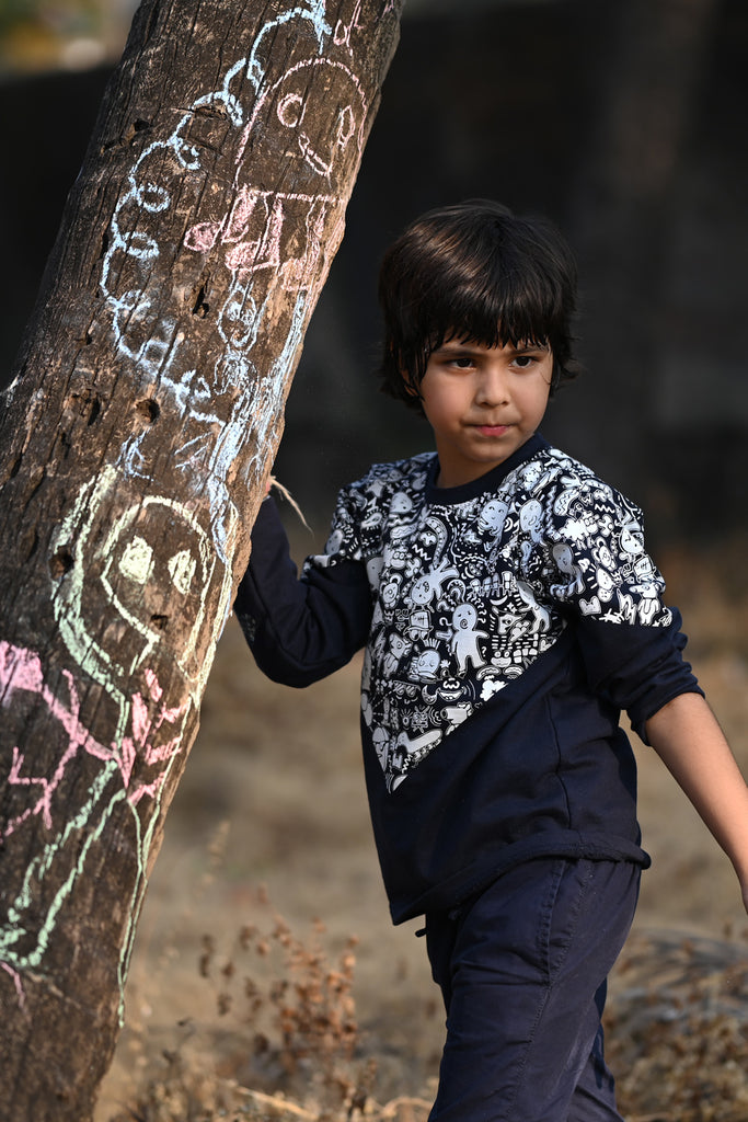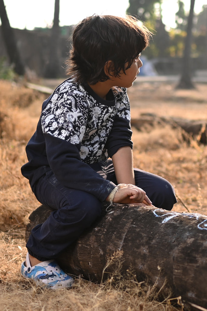 This Navy blue sweatshirt with a preppy placement print is one of the latest outfits for all-year-round wear. The comfy raglan sleeves make it suitable even for cold days. The round neck is very modern. The best part is the simplicity of details of the print and silhouette.