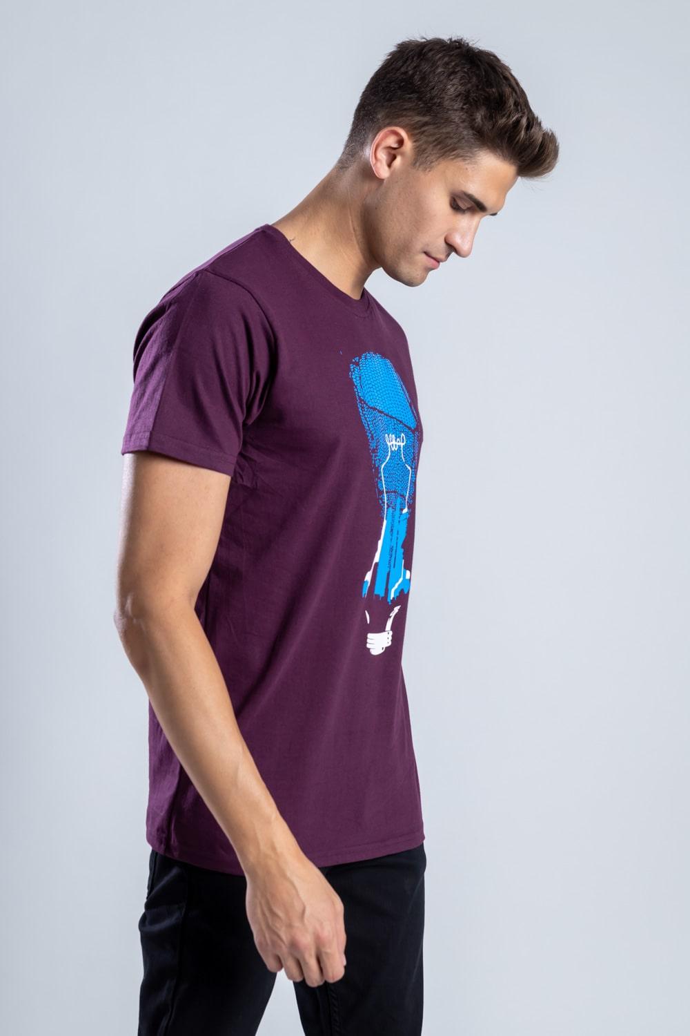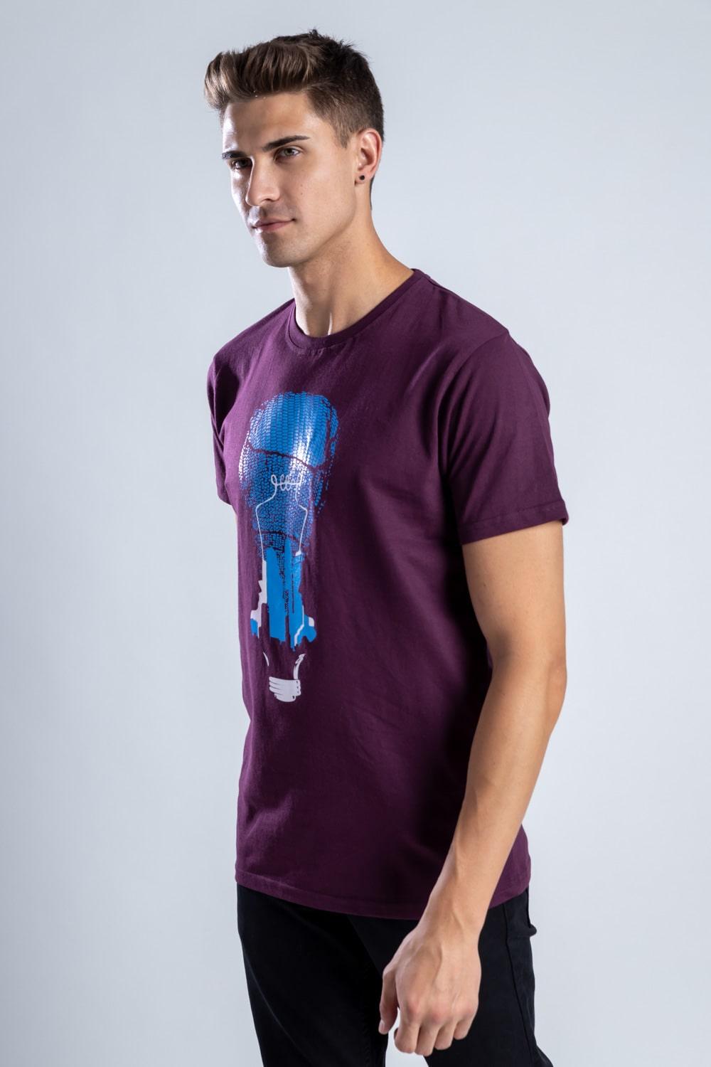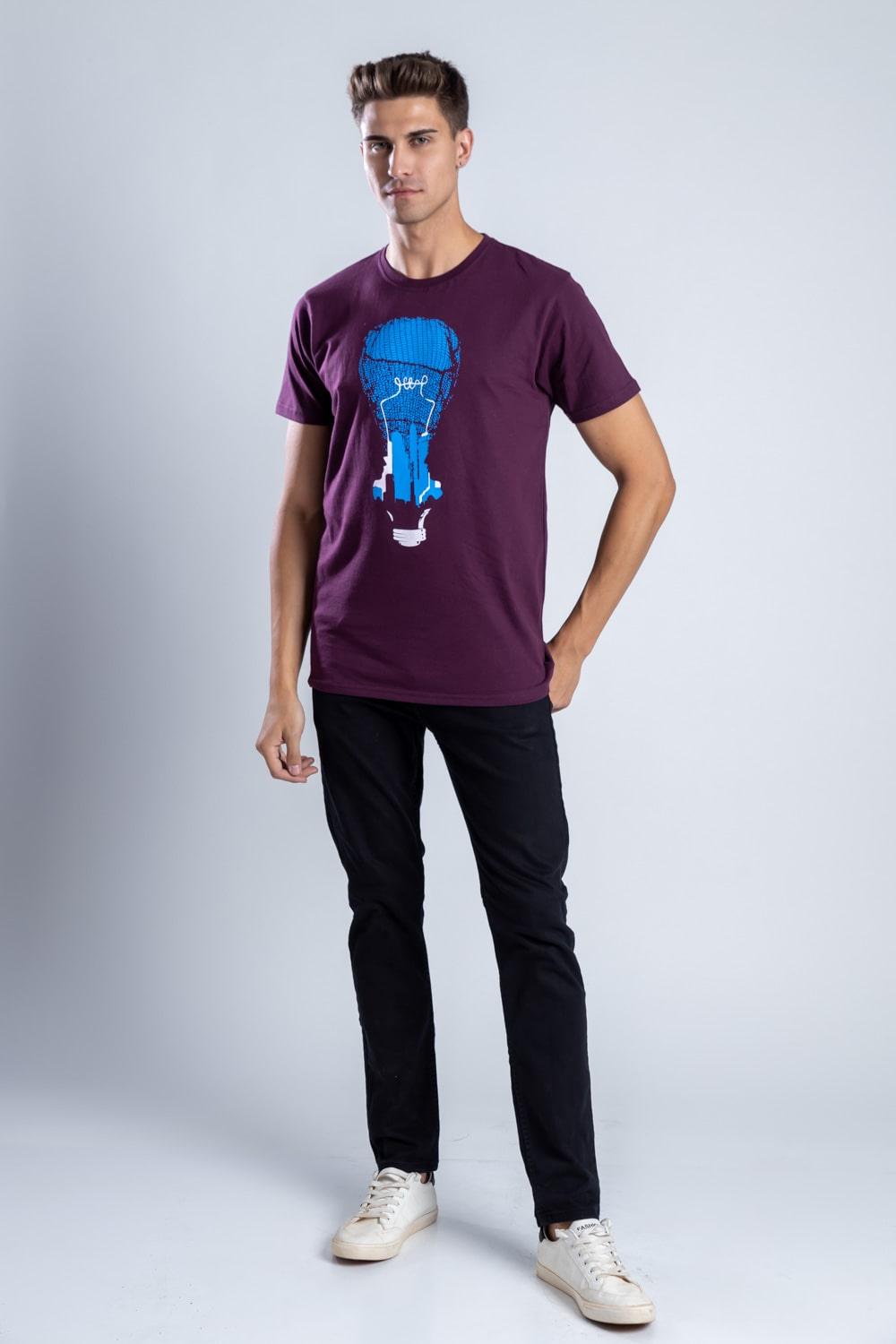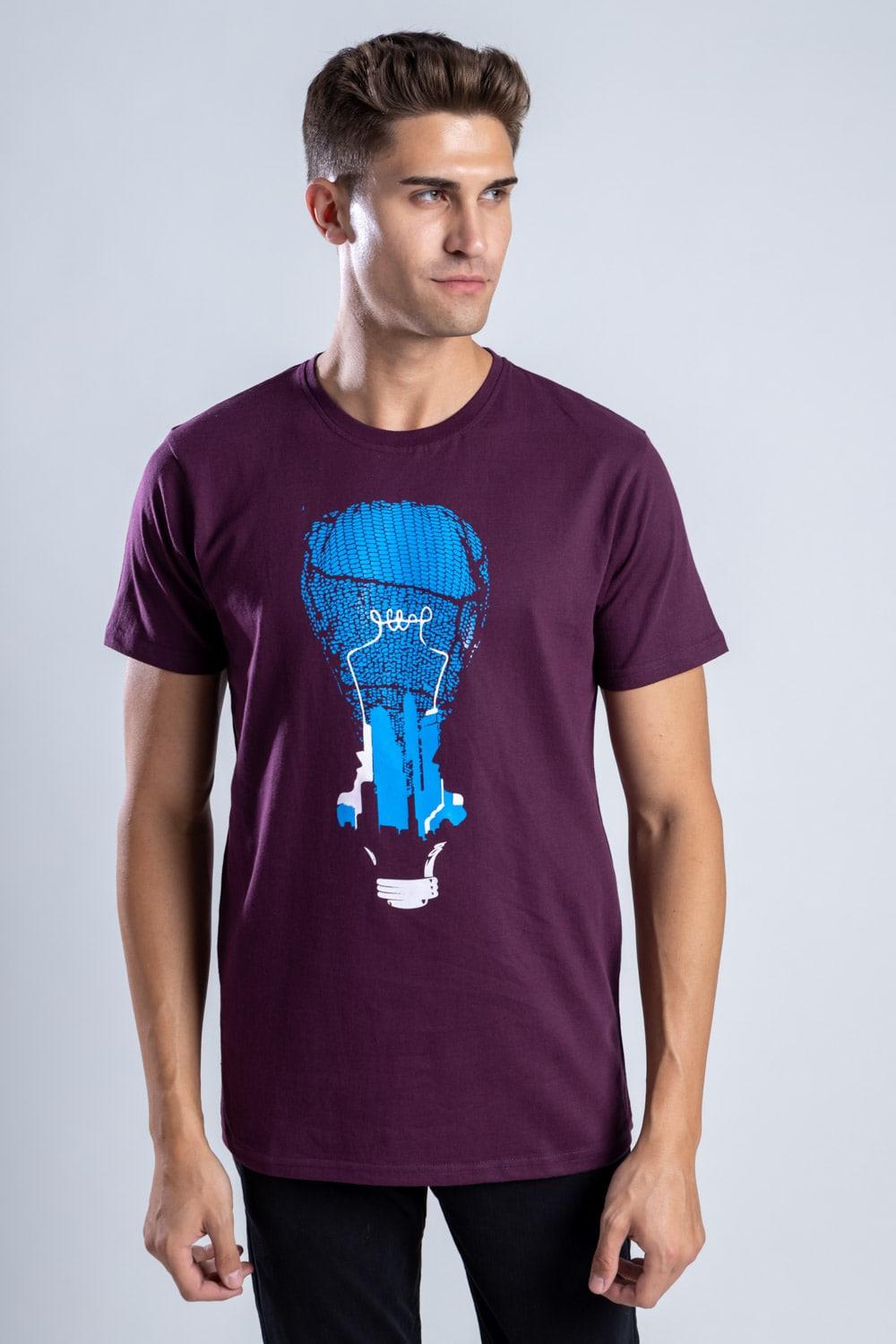 Shift from AM to PM in style with this winning wine colored t-shirt. Featuring a classic round neck, it features an artistic design symbolizing an illusionary world we are all trapped in. Focusing on monetary things and not inner peace or satisfaction. Flaunt this unique recycled cotton t-shirt with an even unique message. Perfect for your next social event.