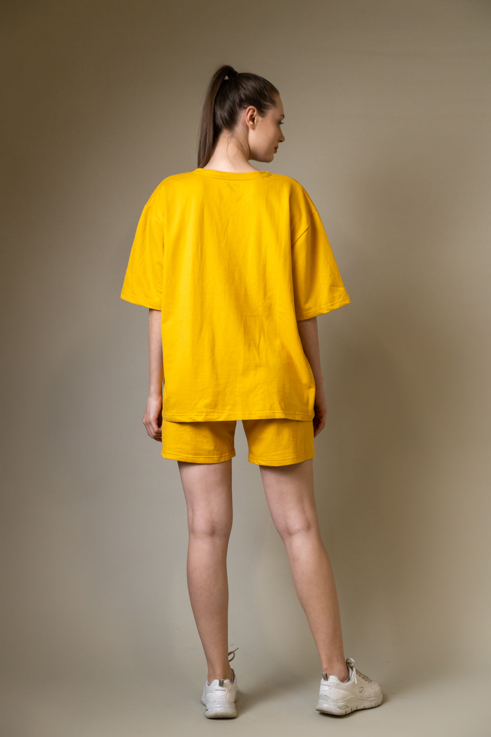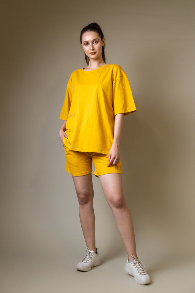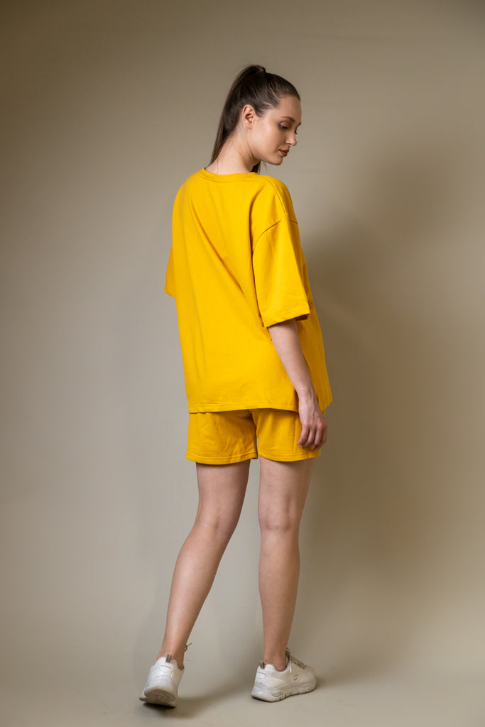 The shorts have a comfortable fit, and the oversized t-shirt can be styled in many ways, allowing you to achieve a casual or chic look with ease. The loopback texture inside of the medium weight fabric adds an extra layer of softness and comfort, making it gentle on the skin.